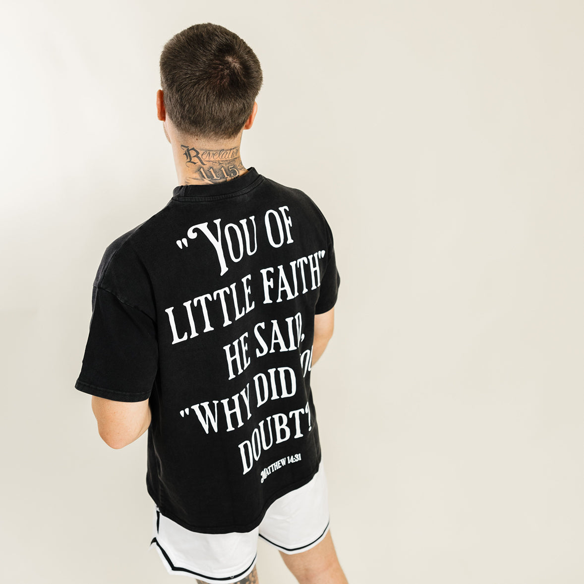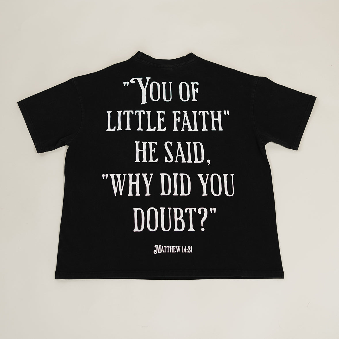 Heavyweight acid-wash t-shirt made with 100% cotton, modeled after Matthew 14:31 (see product details for more).
